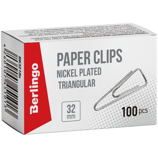 Скрепки 32 мм, 100 шт «Berlingo», никелированные треугольные, с отогнутым носиком