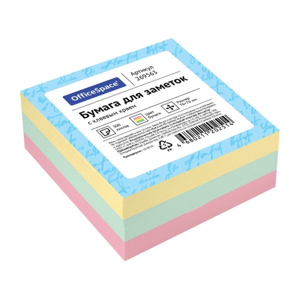 Блок самоклеящийся OfficeSpace 76*76 мм, 300 л, 3 пастельных цвета
