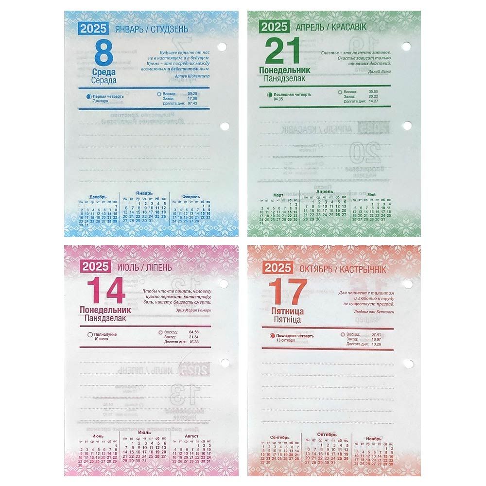 Календарь настольный перекидной. Офсетная бумага, 4-х цветная печать. Каждый квартал разного цвета. Указано время восхода-захода солнца, продолжительность дня, фазы луны, афоризмы на каждый день. В календаре указаны белорусские праздничные и выходные дни.