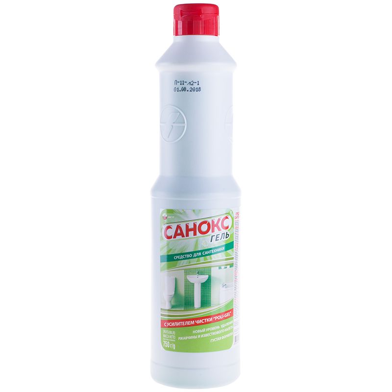 Средство чистящее для сантехники «Санокс-гель», 750 г, жидкое средство для чистки раковин, унитазов, ванн, кафеля и другого сантехнического оборудования. Эффективная формула чистящего и дезинфицирующего средства без ХЛОРА!!! Применяется для удаления ржавчины, мыльных осадков, жира и глубоко въевшейся грязи, застарелых солевых отложений и известкового налета. Устраняет неприятный запах. Содержит щавелевую кислоту, уничтожает возбудителей кишечных инфекций. Не применять для чистки чувствительных к действию кислот поверхностей (мрамор, тонкая эмаль).