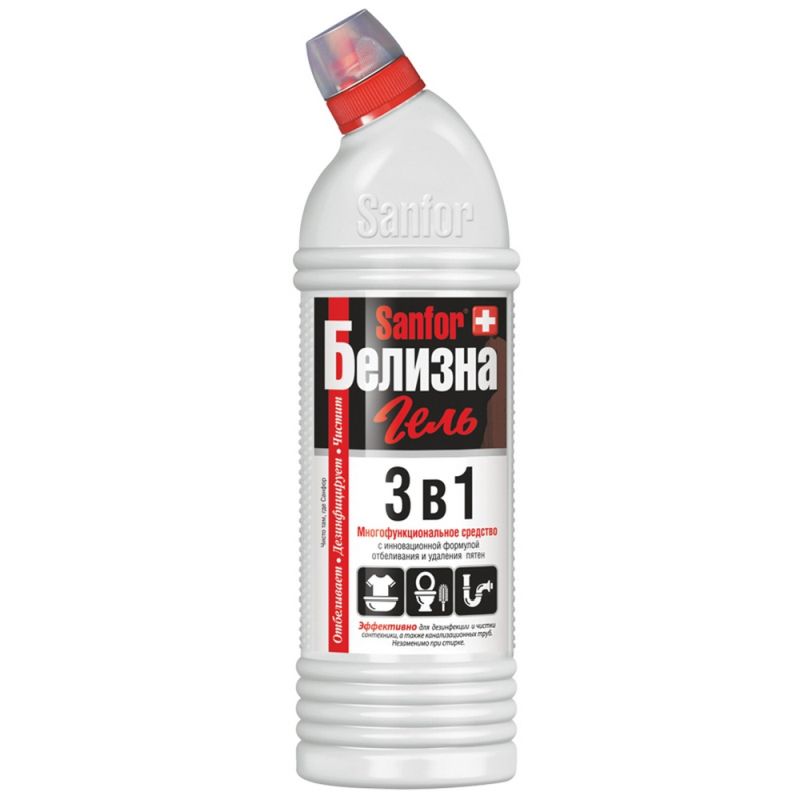 Средство чистящее универсальное Sanfor «Белизна гель 3в1», 700 г, универсальное специальное густое средство с инновационной формулой отбеливания и удаления пятен. Благодаря комплексному действию незаменимо при чистке и дезинфекции сантехники, стирке, эффективно для чистки труб. Многофункциональное средство отбеливает, дезинфицирует и чистит ванны, раковины, унитазы, канализационные стоки, пол, кафель, пластик, посуду (за исключением металлической). Густая гелеобразная формула хорошо удерживает средство на вертикальных поверхностях. Белизна-гель сохраняет свои уникальные свойства в течение 12 месяцев с даты производства и при отрицательных температурах. Не рекомендуется использовать средство при стирке шелка, шерсти, непрочно окрашенных тканей.