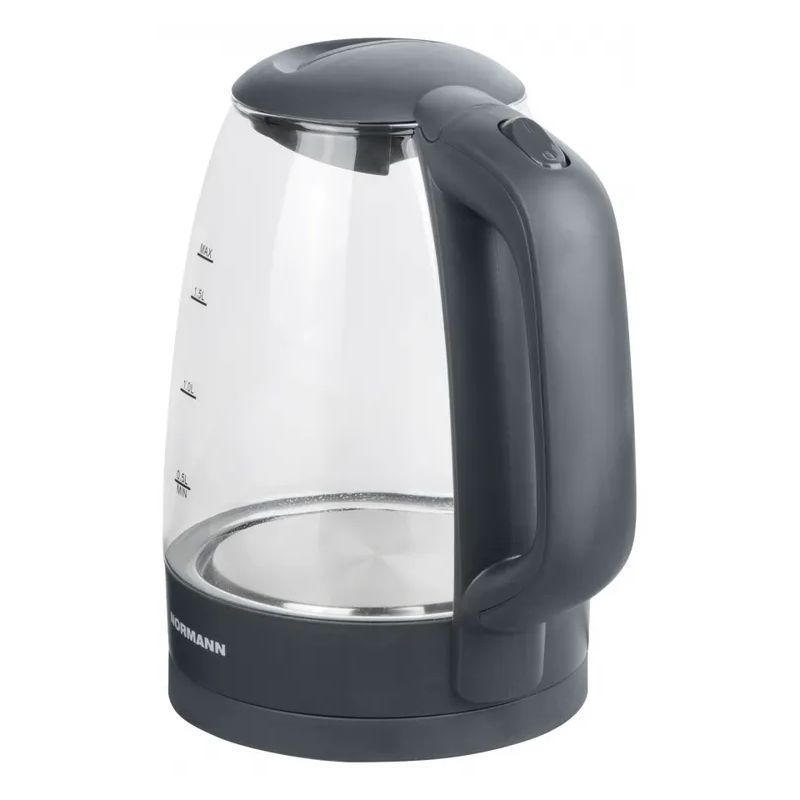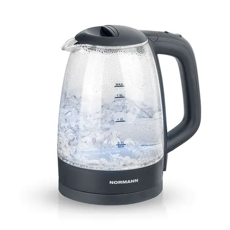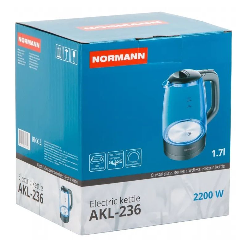 Чайник электрический AKL-236 NORMANN, стекло, черный, Предназначен для подогрева, кипячения воды, приготовления горячих напитков. Встроенный контроллер автоматически отключит чайник при достижении температуры кипения воды. Стеклянный корпус имеет привлекательный внешний вид, позволяющий легко контролировать уровень воды в чайнике. Для удобства пользования подставка оснащена отсеком для сетевого кабеля, за счет этого он не будет мешать в процессе эксплуатации. В качестве индикации включения используется внутренняя подсветка. Закрытый нагревательный элемент обеспечивает равномерный нагрев и удобство обслуживания.