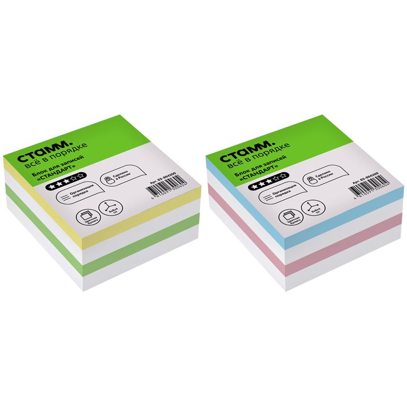 Блок для записей СТАММ «Стандарт», 8*8*4 см, ассорти, цветной, для оперативных записей любыми видами ручек и карандашей. Размер листа в блоке — 80х80 мм, высота блока — 40 мм. Наиболее удобен при использовании в настольных органайзерах и пластиковых подставках. Блок для записей представлен в индивидуальной упаковке в термоусадочной пленке.