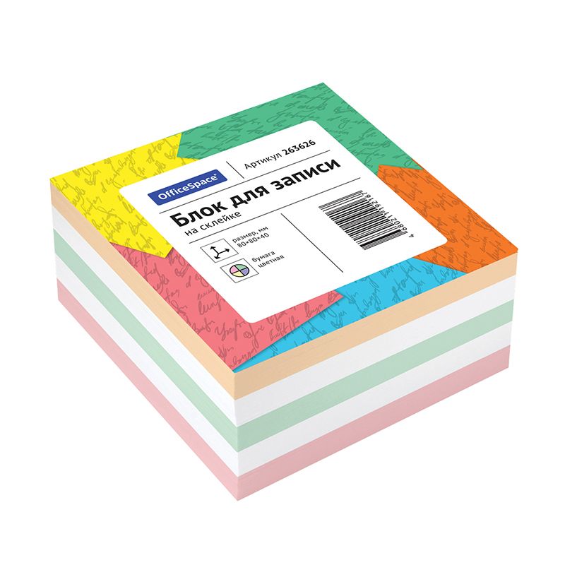 Блок для записи на склейке OfficeSpace, 8*8*4см, цветной. Отрывной блок для оперативных записей любыми видами ручек и карандашей поможет сохранить важную информацию и интересные идеи. Размер листа в блоке: 8*8*4 см. Плотность бумаги: белая — 60 г/м2, цветная — 80 г/м2. Блок может использоваться как в настольных органайзерах и пластиковых подставках, так и без них, поскольку листы склеены между собой. Товар представлен в индивидуальной упаковке в термоусадочной пленке.