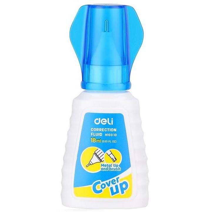 Корректирующая жидкость «Deli» с двусторонним аппликатором. Совмещает классическую корректирующую жидкость с кисточкой и корректор-ручку в одном флаконе. Позволяет проводить более точную корректировку при помощи металлического наконечника или более объемную с помощью кисточки. Состав корректора создает плотное покрытие корректируемого участка. Подходит для печатного и рукописного текста.