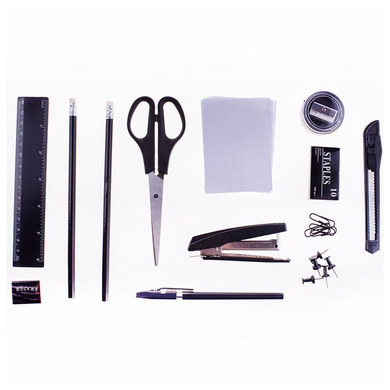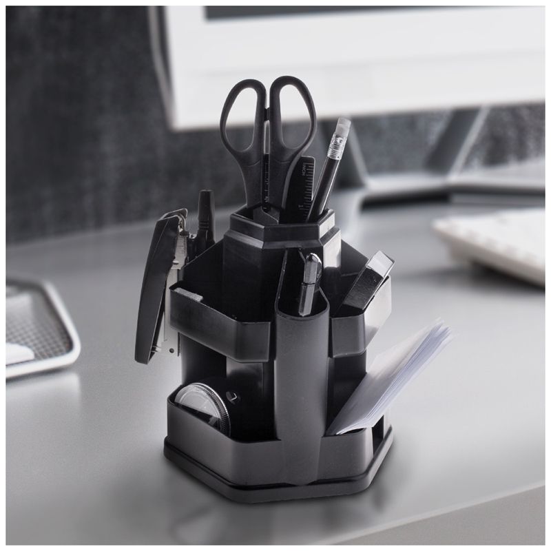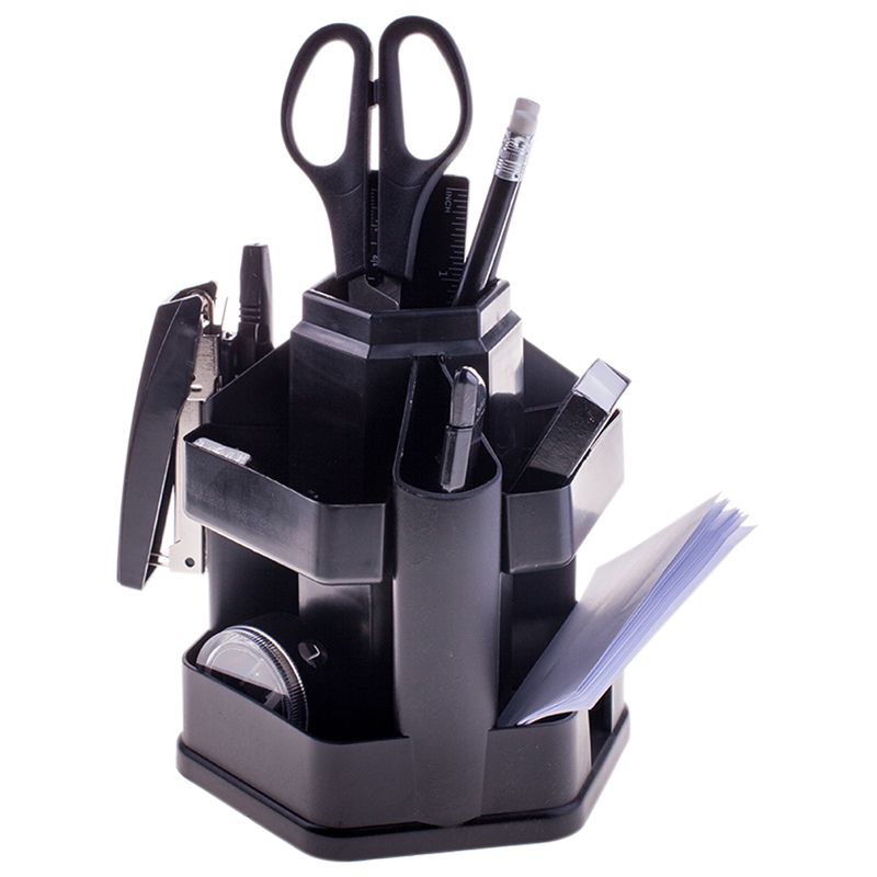 Офисный набор канцелярских принадлежностей «ОФИСНЫЙ» с вращающейся подставкой, 13 предметов, черный. Диаметр основания 14 см. В набор входят: линейка, 2 карандаша, ластик, скобосшиватель, антистеплер, скобы для степлера, ручка, ножницы, скрепки, кнопки-иглы, резак канцелярский малый, точилка для карандашей (возможны незначительные изменения).