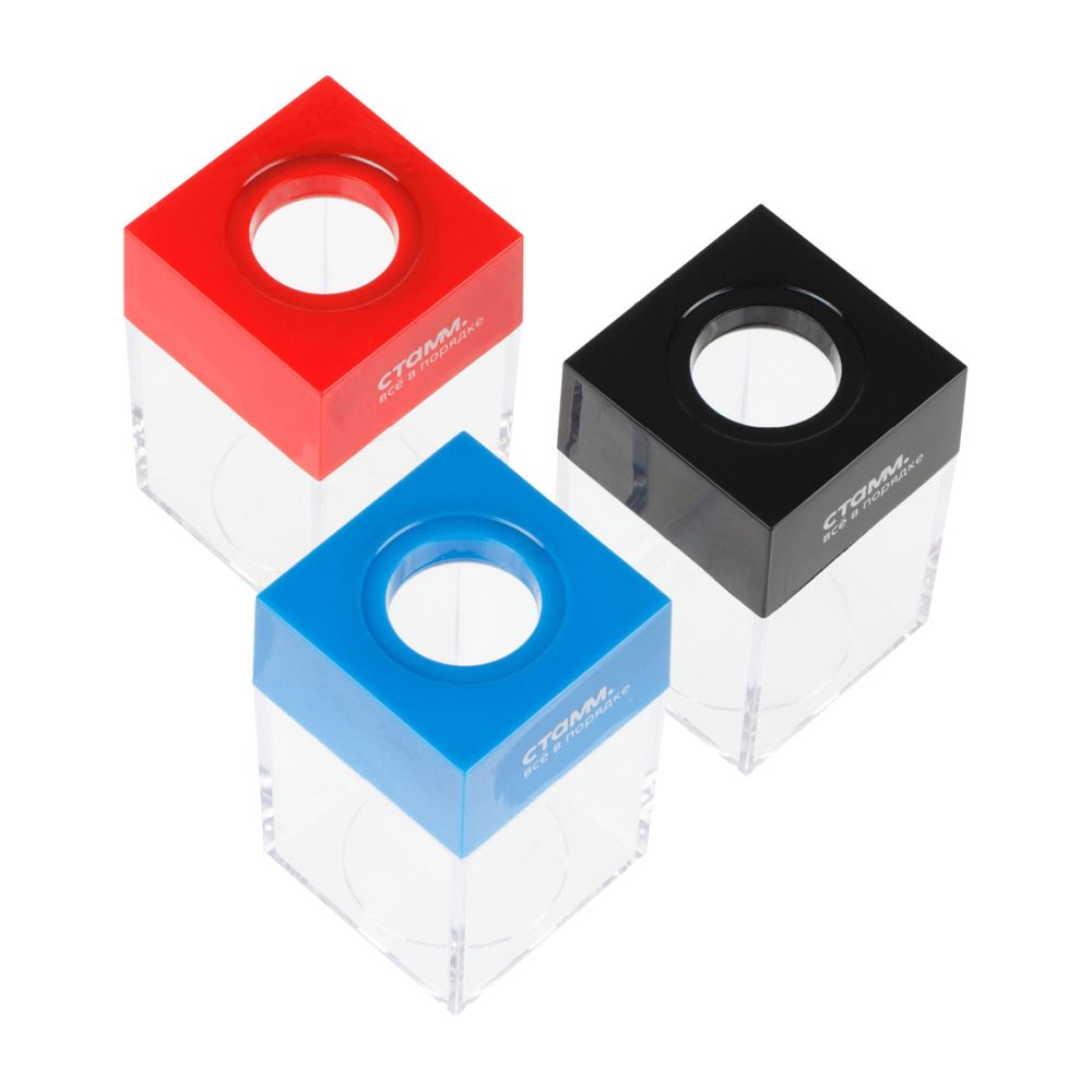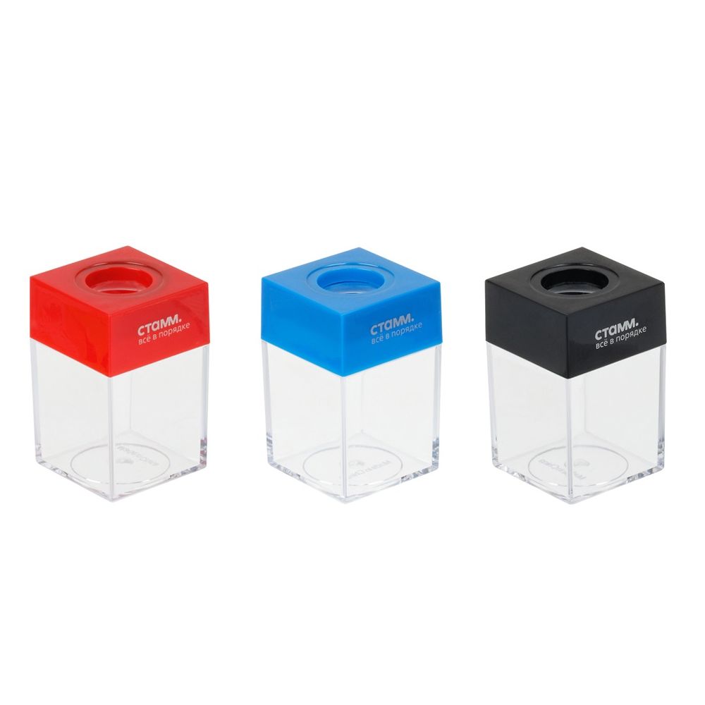Скрепочница магнитная СТАММ, без скрепок, ассорти, квадратная из прозрачного пластика, предназначена для хранения канцелярских скрепок. Компактный и легкий диспенсер прямоугольной формы 60*35*35 мм. Скрепочница оснащена магнитом для удобной фиксации скрепок. Цвет верхней крышки в ассортименте. Поставляется без скрепок.