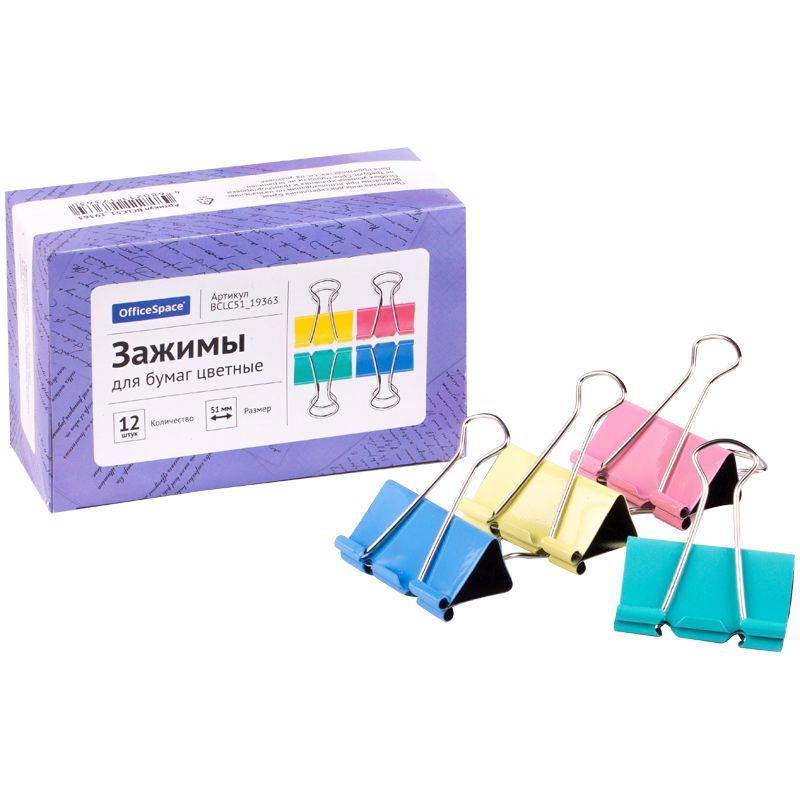 Зажим для бумаг, 51 мм, цветные, уп.12 шт., OfficeSpace