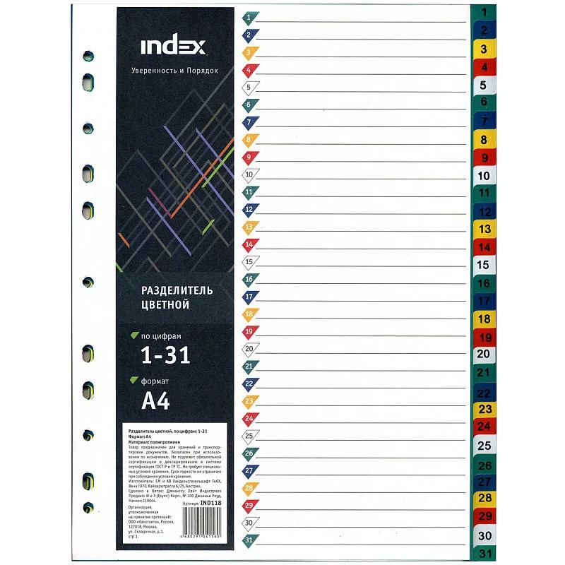 Разделитель пластиковый, цифровой 1-31, цветной, А4 для листов в папке. Разделитель изготовлен из гибкого пластика. Предназначен разделитель листов для систематизации документов в архивных папках формата А4. Листы разного цвета имеют цифровую маркировку. Универсальная мультиперфорация разделителя совместима с папками на кольцах или папками-регистраторами с арочным механизмом.