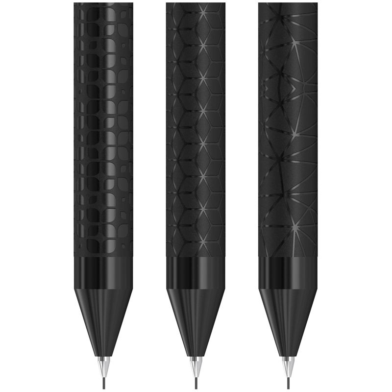 Карандаш автоматический Berlingo «Doubleblack» 0,5 мм, с ластиком. Механический карандаш с дизайном стильной серии DoubleBlack выглядит строго, но оригинально, благодаря глянцевому узору на черном матовом фоне. Снабжен двумя запасными грифелями самого популярного диаметра 0,5 мм и встроенным ластиком. Подача грифеля осуществляется с помощью кнопочного механизма.
