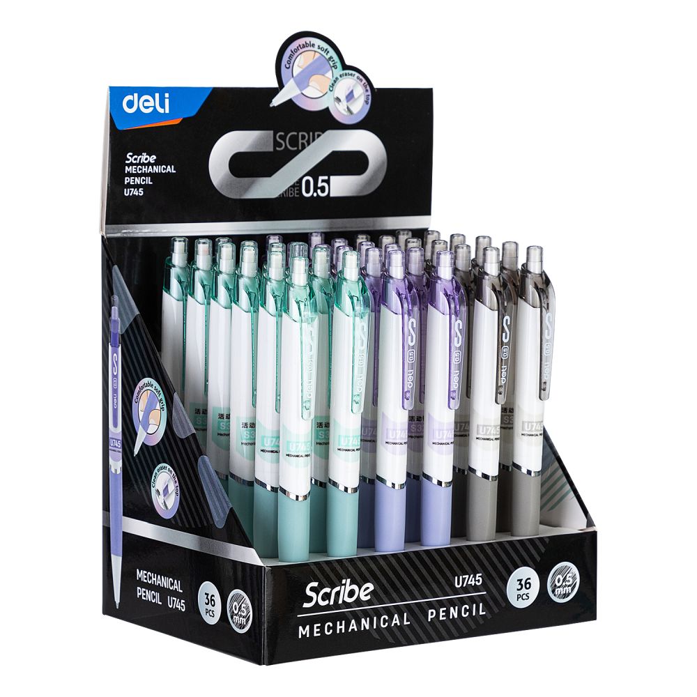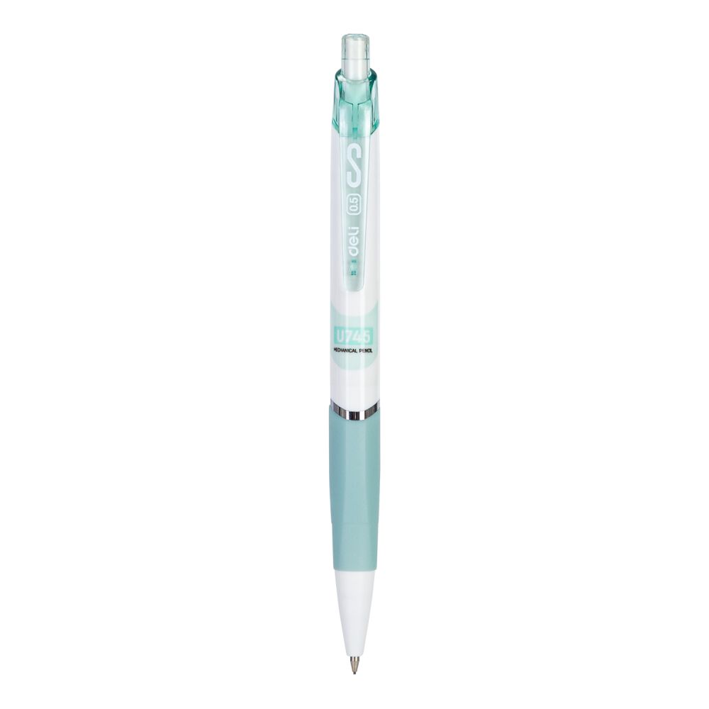 Карандаш автоматический Deli «Scribe U745» 0,5 мм, пластиковый корпус с эргономичной грип-зоной. Оснащен ластиком, металлическим наконечником и пластиковым клипом. Цвет корпуса белый с цветными деталями. Эргономичная трехгранная форма корпуса.