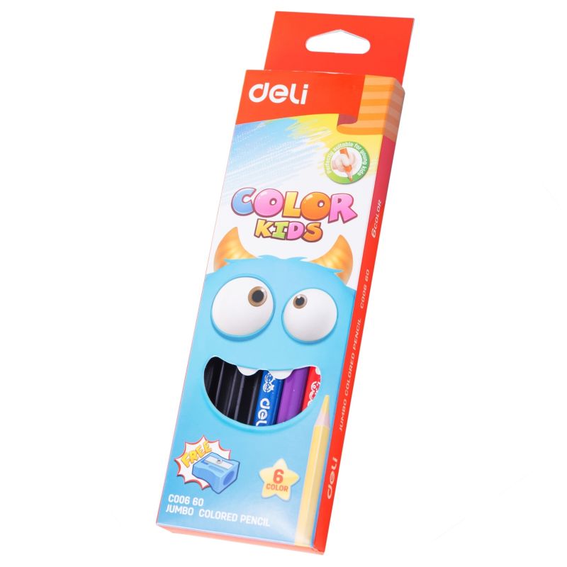 Карандаши цветные Deli «COLOR KIDS Jumbo», 6 цветов, трехгранные специально разработаны для маленьких детей в возрасте от 3 до 7 лет. Имеют утолщенный корпус для более комфортного пользования детской рукой. Утолщенный ударопрочный грифель диаметром 5,0 мм обеспечивает мягкое рисование и быстрое закрашивание. Легко затачиваются и не ломаются. Эргономичная трехгранная форма корпуса создает дополнительный комфорт при использовании. Упакованы в картонную коробку.