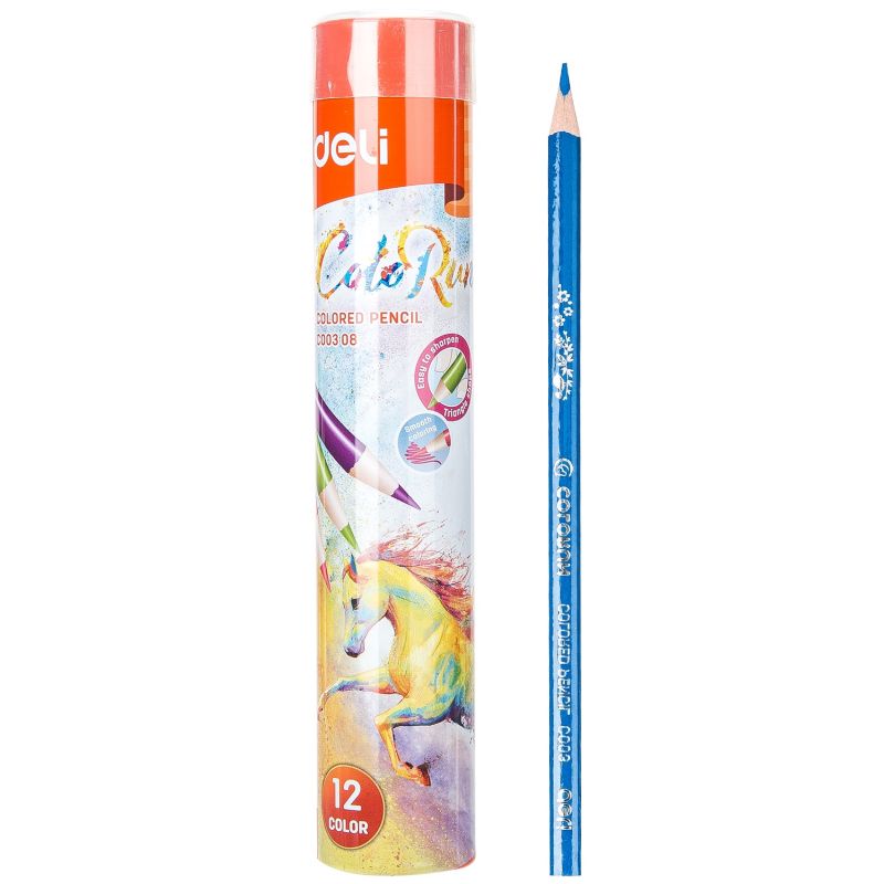 Карандаши цветные Deli «ColoRun», 12 цветов, трехгранные, в тубе. Изготовлены из мягкой древесины тополя, имеют яркие и насыщенные цвета. Грифель диаметром 3,0 мм позволяет рисовать легко и мягко. Легкий и прочный металлический пенал-тубус обеспечивает удобное использование и хранение.