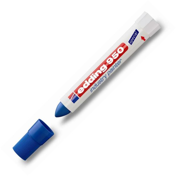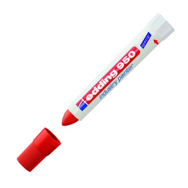 Маркер-паста «Edding 950» для промышленного использования. Корпус маркера изготовлен из прочного пластика. Маркирующим веществом выступает высокостойкая пигментная мастика. После нанесения на поверхность мастика застывает в течение несколько секунд. Надпись, нанесенная промышленным маркером «Edding 950», устойчива к выгоранию, к смыванию водой, истиранию механическим путем. Паста термостойкая, выдерживает температуру до 300 C. Толщина письма – 10 мм.
