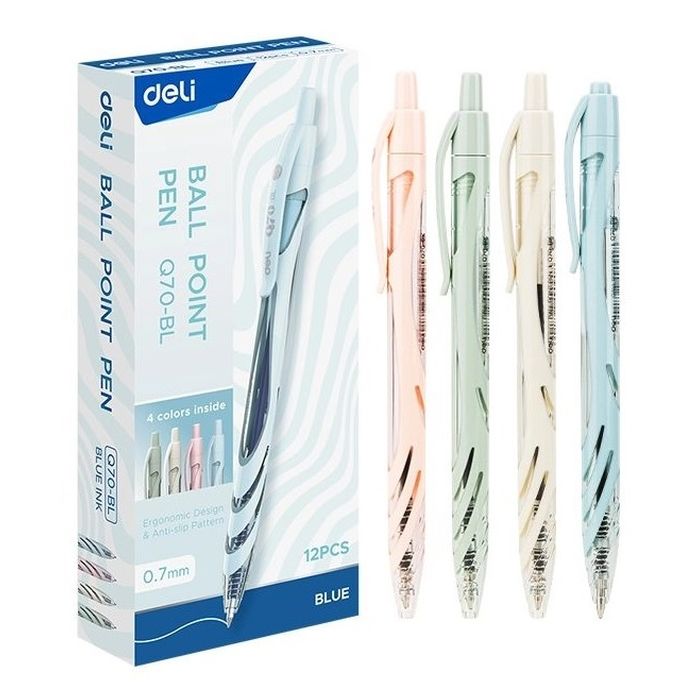 Ручка шариковая автоматическая Deli «Q70» 0,7 мм, синяя, пластиковый корпус c антискользящим покрытием. Цвет корпуса ассорти в пастельных тонах. Заправлена чернилами на масляной основе пониженной вязкости, обеспечивающими мягкое ровное письмо и уверенное скольжение по бумаге. Удобный легкий корпус лаконичной формы комфортен для письма.
