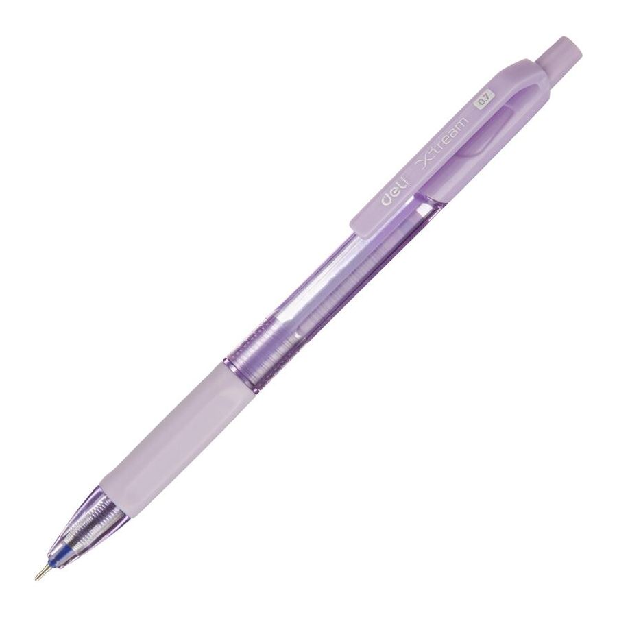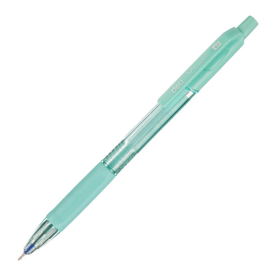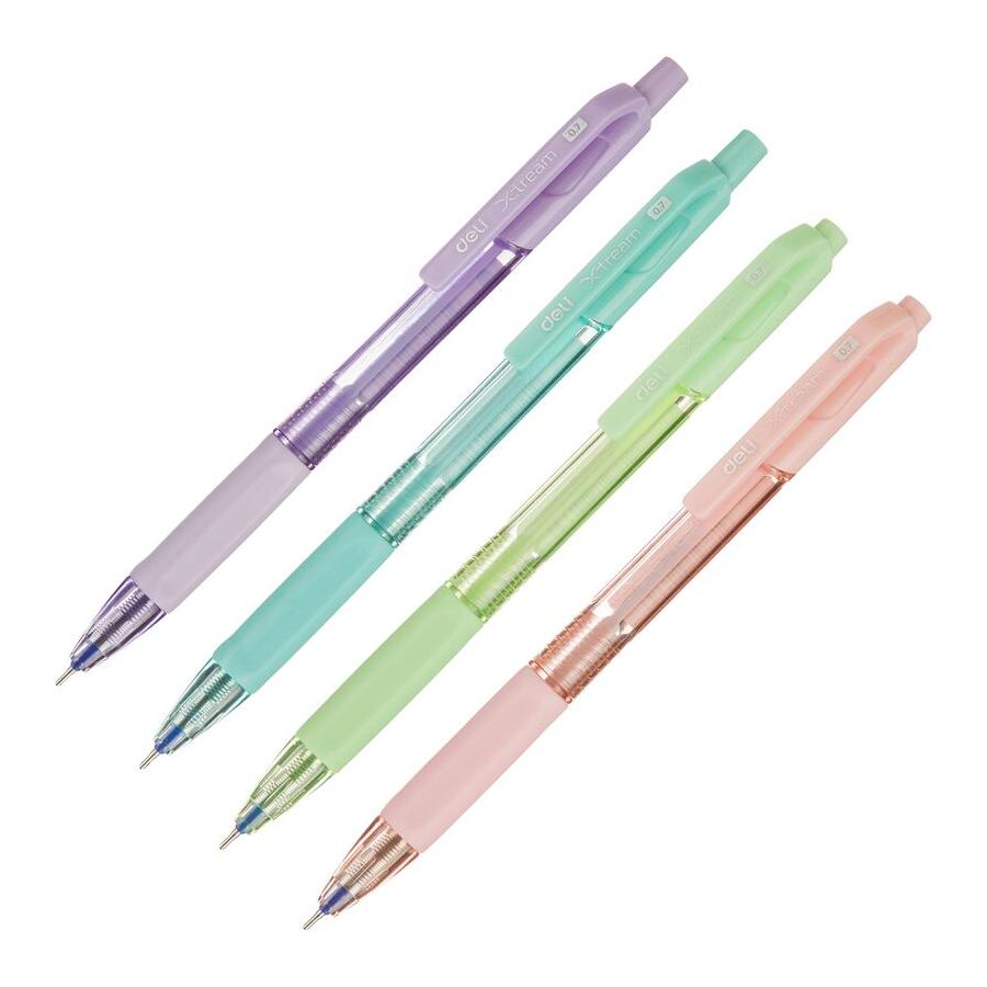 Ручка шариковая автоматическая Deli «X-tream» 0,7 мм, синяя, пластиковый корпус нескольких цветов ассорти: бирюзовый, розовый, салатовый, фиолетовый. Заправлена чернилами на масляной основе пониженной вязкости, обеспечивающими мягкое ровное письмо и уверенное скольжение по бумаге. Мягкий резиновый грип снижает давление на пальцы рук при письме. Легкий корпус лаконичен по форме и удобен при письме.