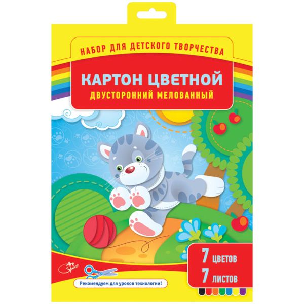 Картон цветной двусторонний, А4, 7 листов, 7 цветов, мелованный, в папке. Набор цветного картона для творчества. Картон цветной двусторонний имеет яркие цвета, упакован в картонную папку с красочным изображением. Безопасен в применении.
