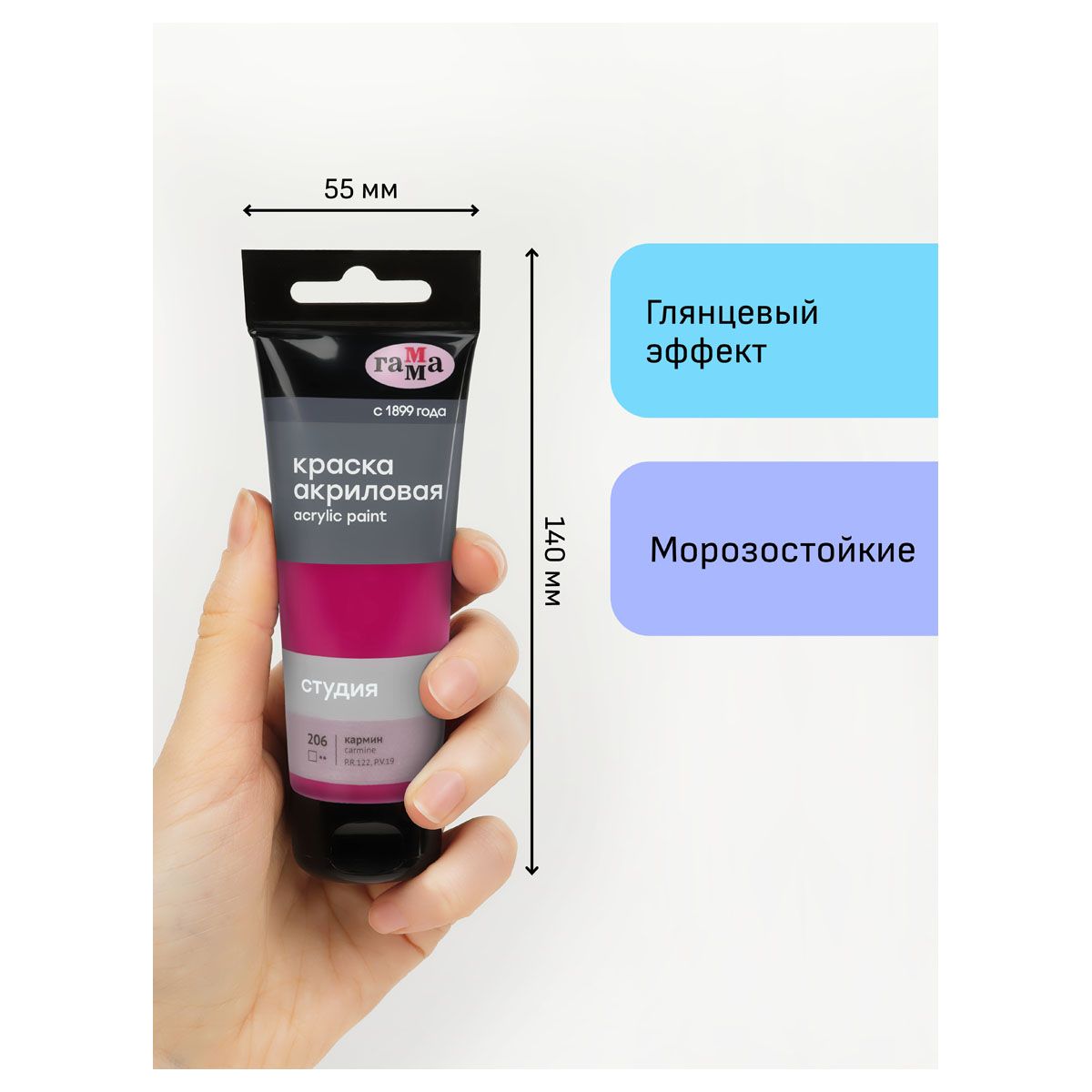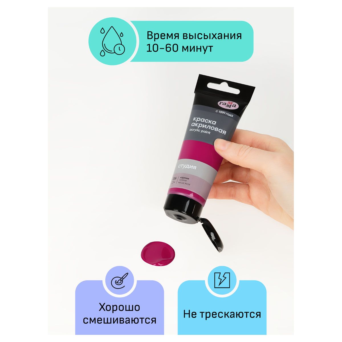 Краска акриловая художественная Гамма «Студия», 75мл, кармин, пластиковая туба, предназначена для художественно-живописных и декоративно-прикладных работ. Главные отличия: насыщенный цвет, густая консистенция, высокая адгезия, прочность красочного слоя. После высыхания краска становится глянцевой, практически не темнеет, специальная добавка позволяет максимально раскрыть красоту цвета. Художественный акрил прекрасно разносится, подходит для бумаги, картона, грунтованного холста, дерева, стекла, кожи, ткани. Время высыхания: от 10 минут до 1 часа в зависимости от толщины слоя. Прозрачный корпус тубы позволяет увидеть цвет краски, а удобная крышка флип-топ предотвращает высыхание.
