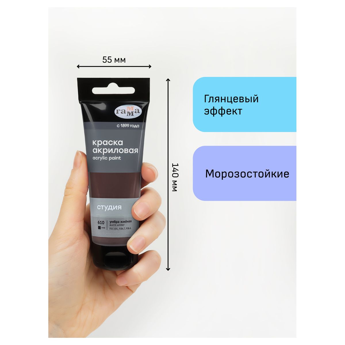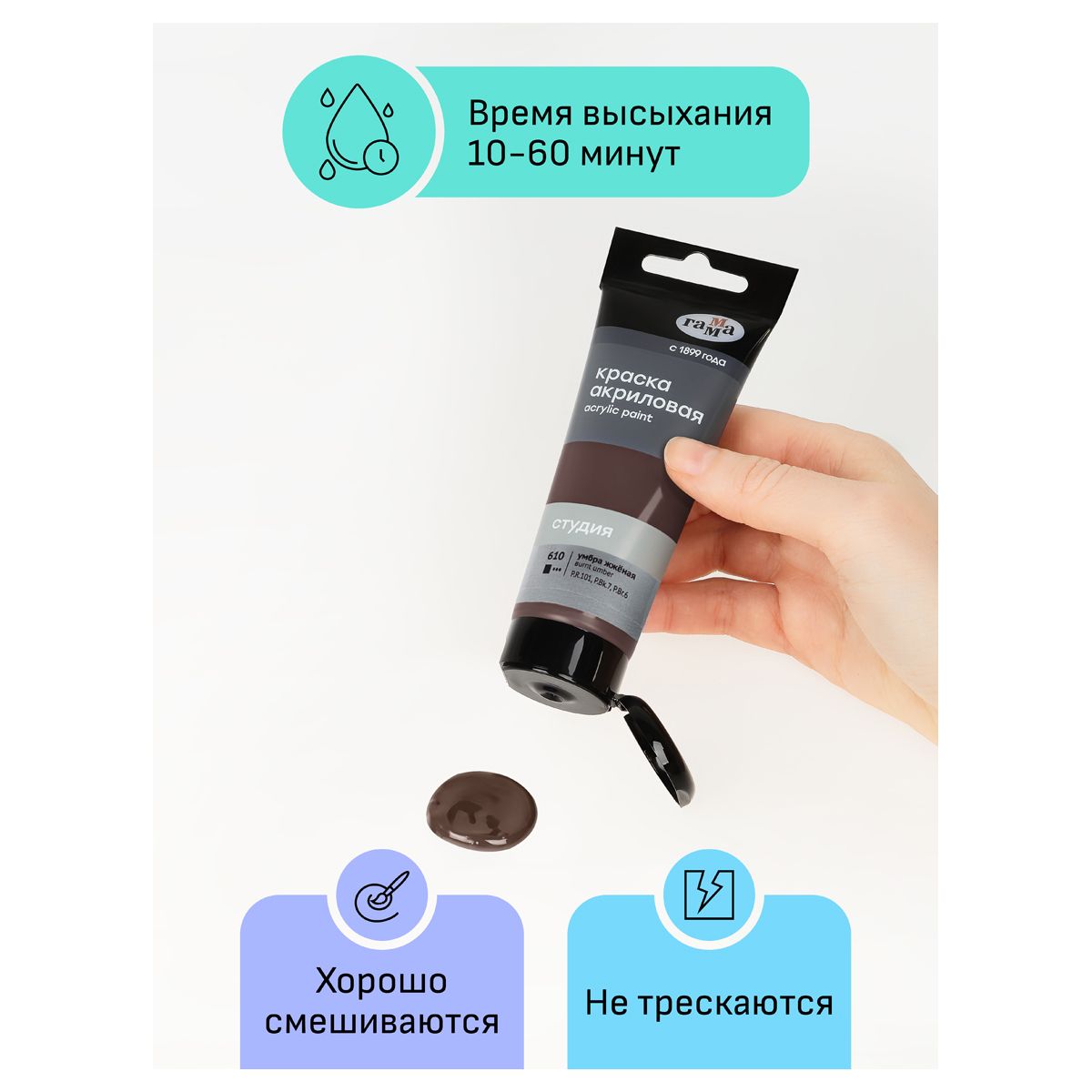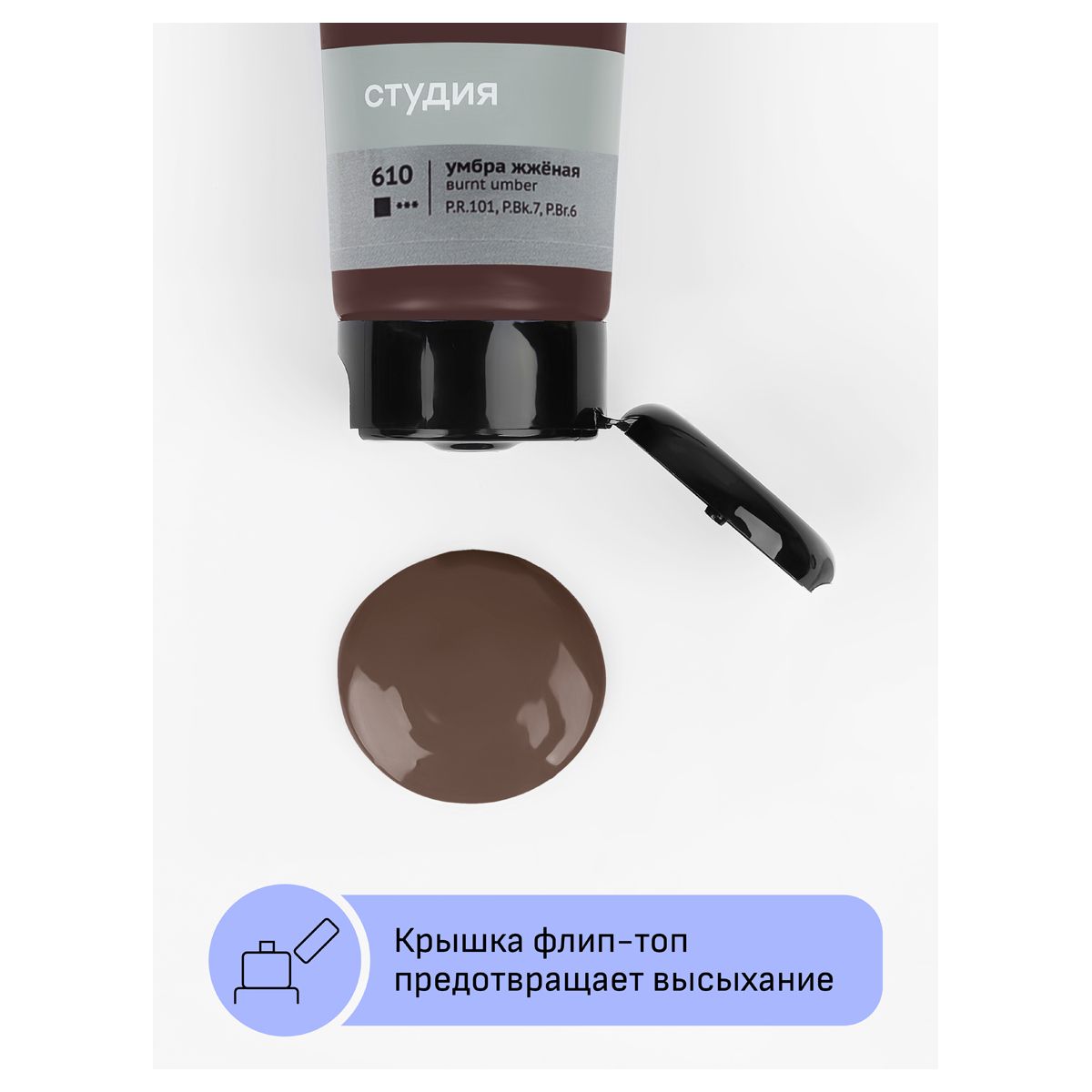 Краска акриловая художественная Гамма «Студия», 75мл, умбра жженая, пластиковая туба, предназначена для художественно-живописных и декоративно-прикладных работ. Главные отличия: насыщенный цвет, густая консистенция, высокая адгезия, прочность красочного слоя. После высыхания краска становится глянцевой, практически не темнеет, специальная добавка позволяет максимально раскрыть красоту цвета. Художественный акрил прекрасно разносится, подходит для бумаги, картона, грунтованного холста, дерева, стекла, кожи, ткани. Время высыхания: от 10 минут до 1 часа в зависимости от толщины слоя. Прозрачный корпус тубы позволяет увидеть цвет краски, а удобная крышка флип-топ предотвращает высыхание.